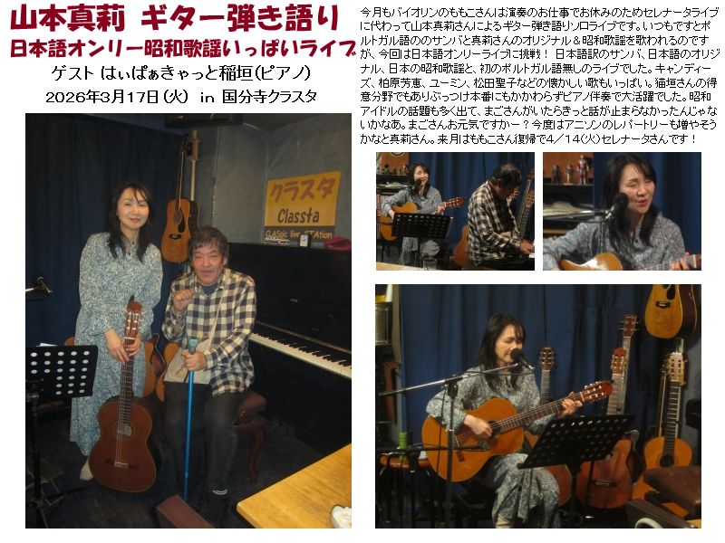 セレナータ サンバ&オリジナルライブ [山本真莉(歌、ギター)、さとうももこ(バイオリン)] Serenata、やまもとまり、さとうももこ 3か月ぶりのセレナータさんです! ギター弾き語り山本真莉とヴァイオリニストさとうももこのユニット。 ポルトガル語原詞でのサンバ・ボサノバと真莉さんの日本語オリジナル曲を演奏します。. 「サヨナラ」youtube https://www.youtube.com/watch?v=lCsM6vLqY-U 底なし桃子さんにお酒おごってあげてくださーい。 ファーストアルバム「音色〜おといろ」大好評発売中! ■山本真莉(Vo,Gt) Mari Yamamoto ■さとうももこ(Violin) ※18時開店19時開演です。 |