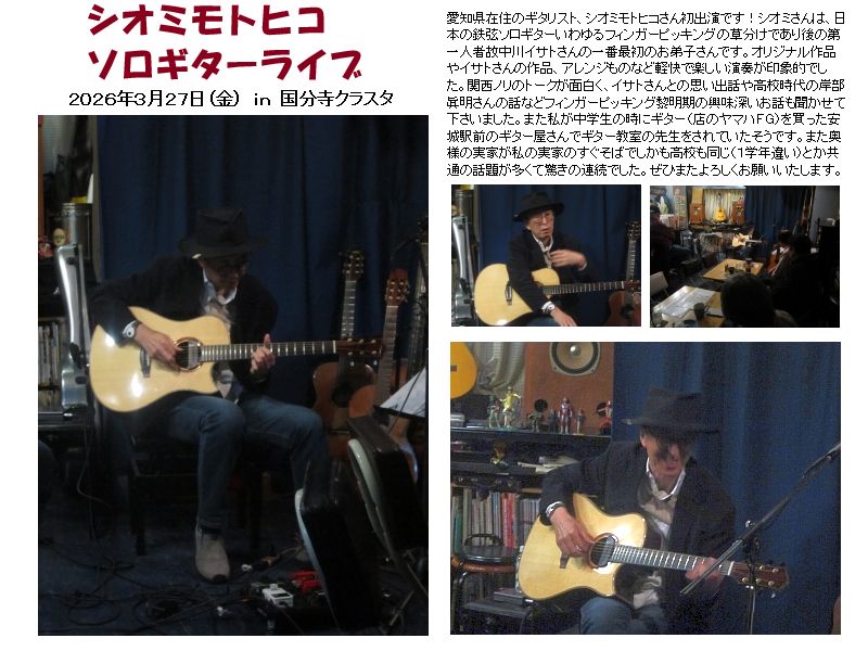高橋正樹ギター道場 by永島清 facebook mixi blog 長年に渡りクラスタのギター文化を育てて下さった高橋正樹さんは、2014年11月26日にご逝去なさいました。 |